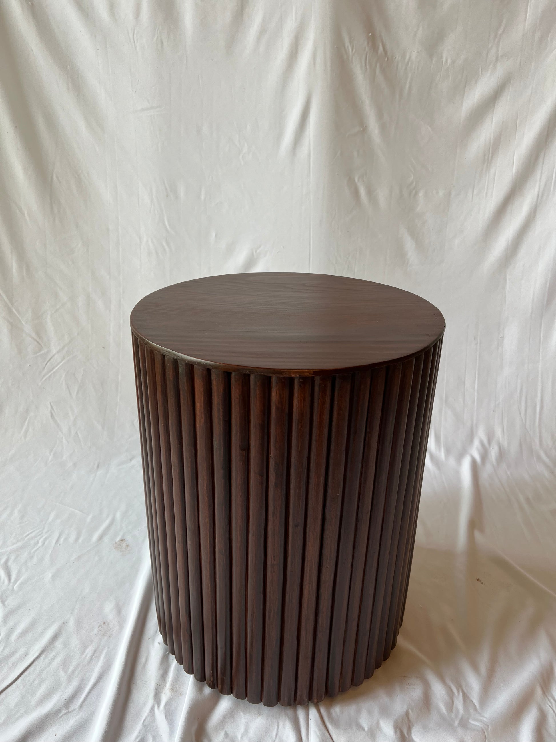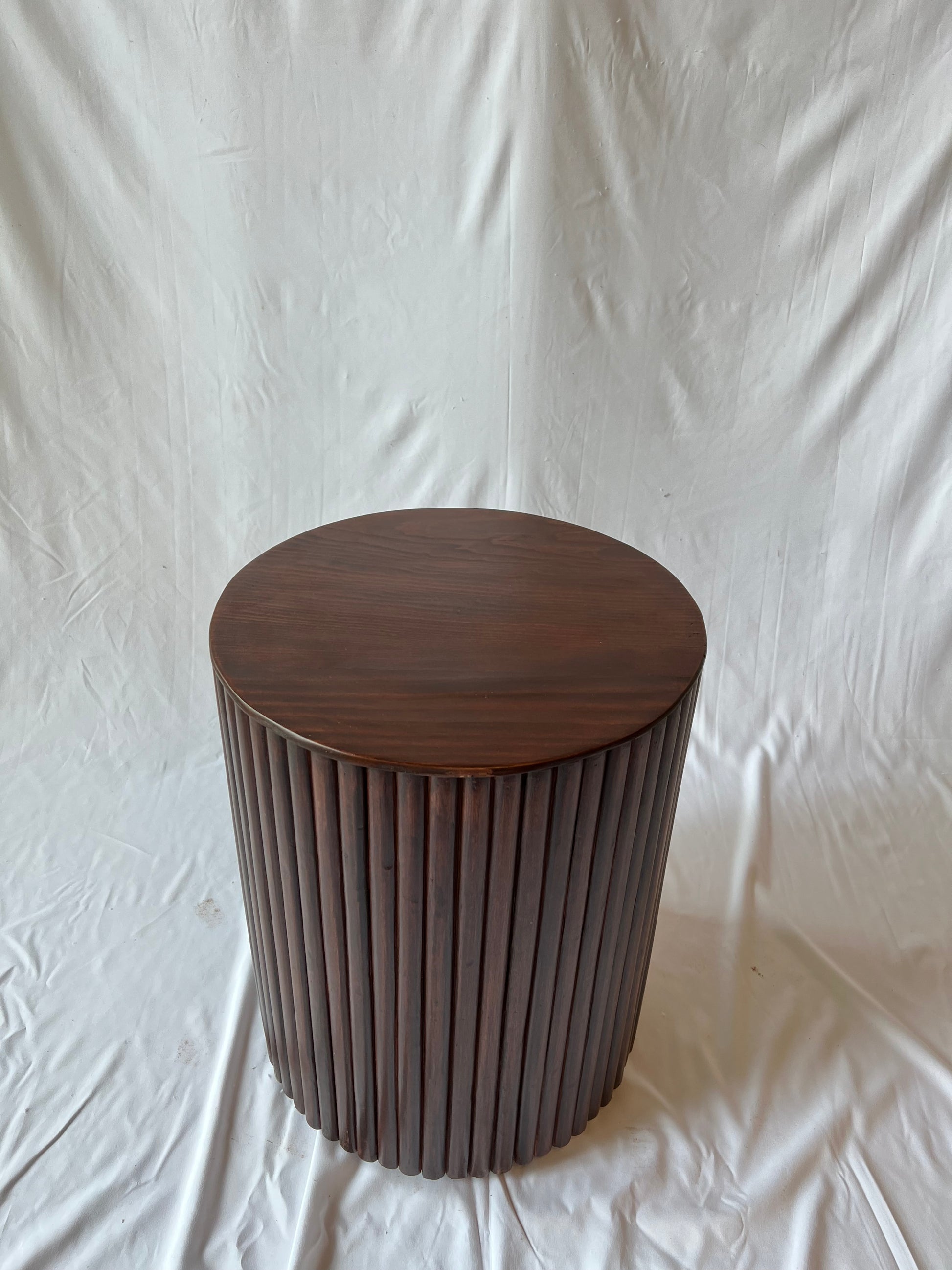 Esta mesita de cedro está entintada al color nogal y tiene la altura perfecta para mesa de noche o una mesa lateral alta.